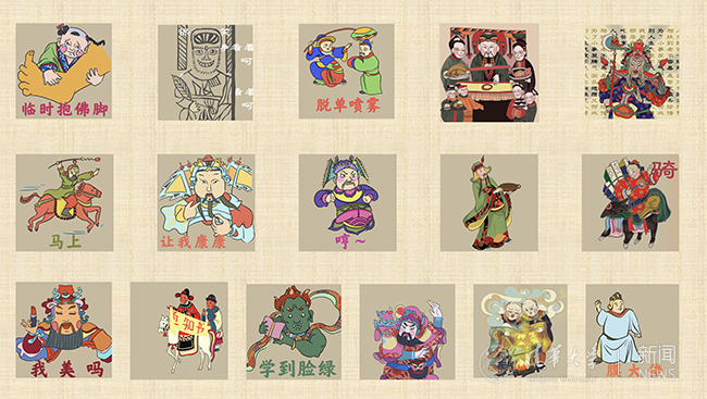 年画方向的团队深入研究了我国各地传统年画中的文化内涵、神态动作、服装配饰等元素,对津冀鲁豫陕川粤各省9个地区的年画风格进行了对比研究,选取其中与当代文化诉求相近、贴合年轻人生活的视觉元素与美好寓意进行再创作,形成了手办模型、微信表情包等作品。手办模型团队在基础工业训练中心利用3D扫描及失蜡法铸造、增材制造等开发了产品原型。