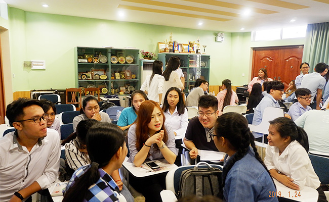 支队成员与皇家金边大学学生分组交流