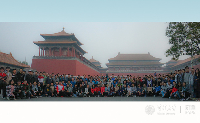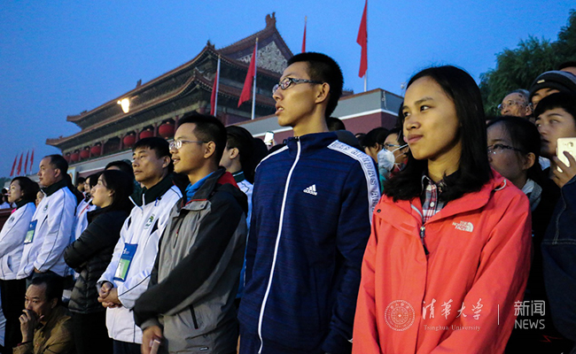观看升旗仪式的清华同学合影。曹玉立 摄