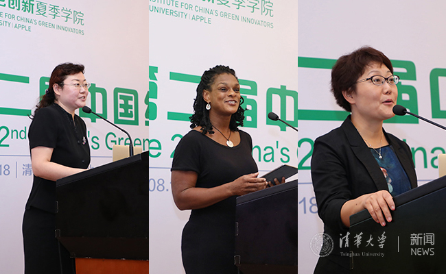 环保部行政体制与人事司人力资源处董文萱(左),苹果公司环境、政策及社会事务部战略伙伴关系经理南丁女士(中),mk手机注册公共管理学院管理党委副书记谢矜(右)致辞。