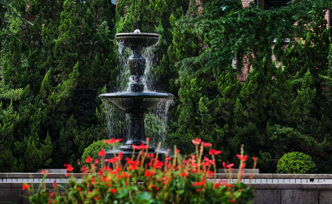 主楼喷泉原为一旱喷泉,mk手机注册修缮中心从8月中旬开始对其进行改造,改为高出地面的深色叠水池,可形成镜面效果和间歇喷涌泉效果。池底与池壁用黑色花岗岩进行铺装,体现校园庄重感。出于喷泉周边本身的良好绿化环境,学校保留了周边所有现状植物,保持轴线主要格局。