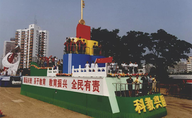清华和当时的工艺美院为国庆50周年庆典联合设计、制作的“科教兴国”超大型彩车
