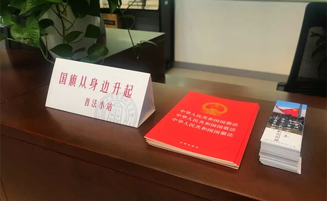 同时,法律图书馆前台设置了“国旗从身边升起·普法小站”,除主题书签外,还放有《国旗法》条文,供同学们翻阅。