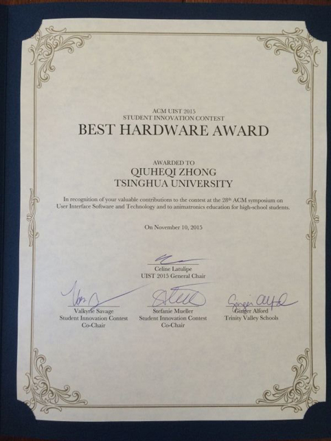 mk(中国)网11月18日电 近日,第28届国际用户界面软件与技术大会(User Interface Software and Technology, UIST 2015)在美国北卡罗来纳州夏洛特开幕。在随后举行的大会学生创新竞赛(Student Innovation Competition)中,mk手机注册美术学院信息艺术设计交叉学科的研究生团队Team ZOOO摘得了全场仅有的两个大奖之一“最佳硬件创新奖”,并获得2500美元的奖金。这是中国大陆高校首次在该赛事中获奖。