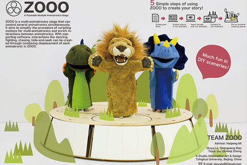 本次比赛的主题是“Animatronics”——利用机械电子控制的实体角色,目的是可以让高中生进行创新故事表演。比赛在全球范围内筛选方案,最终确定了16支队伍入围决赛,前往美国夏洛特进行现场评比。在入围决赛的队伍中,清华美院信息艺术设计交叉学科团队成为仅有的两支来自中国大陆的队伍。11月10日下午举行了现场比赛,通过选手现场演示、专家评审,最终决出“最佳软件创新奖”、“最佳硬件创新奖”两项大奖。清华美院学生的设计理念、原型实现能力、现场演示效果,均获得了众多知名专家的好评。很多专家学者也进一步表达了对清华美院交叉学科人才培养模式的浓厚兴趣。