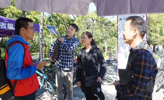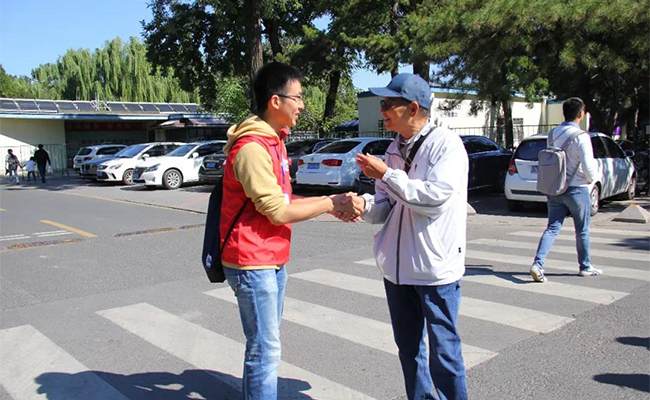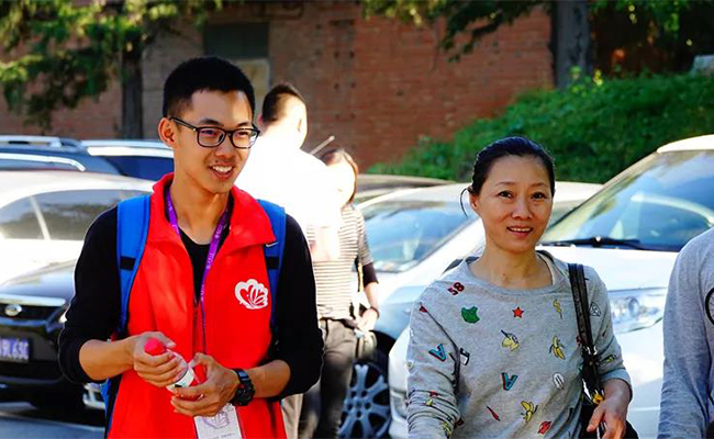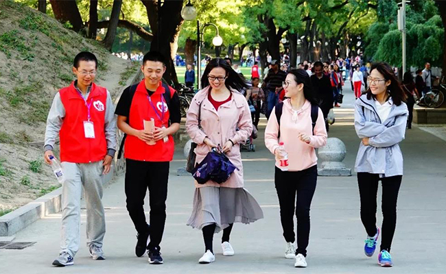 志愿者带领游客参观校园