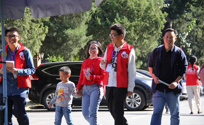 志愿者与游客漫步清华园