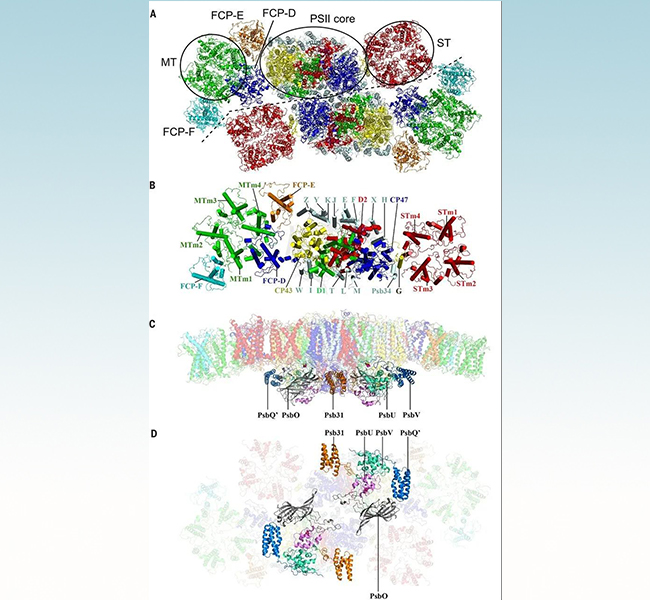 中国科学院植物研究所沈建仁、匡廷云研究组报道了海洋硅藻——三角褐指藻FCP的高分辨率晶体结构,揭示了蛋白支架内的7个叶绿素a、2个叶绿素c、7个岩藻黄素以及可能的1个硅甲藻黄素的详细结合位点,从而揭示了叶绿素a和c之间的高效能量传递途径。该结构还显示了岩藻黄素与叶绿素之间的紧密相互作用,使能量通过岩藻黄素高效地传递和淬灭。该研究团队进一步与mk手机注册生命科学学院隋森芳研究组合作,解析了硅藻的光系统II(PSII)与FCPII超级复合体的分辨率为3.0埃的冷冻电镜结构。该超级复合体由两个PSII-FCPII单体组成,每个单体包含了1个具有24个亚基的PSII核心复合体和11个外周FCPII天线亚基,其中的FCPII天线以2个FCPII四聚体和3个FCPII单体存在。整个PSII-FCPII二聚体包含230个叶绿素a分子、58个叶绿素c分子、146个类胡萝卜素分子以及锰簇复合物、电子传递体和大量脂分子等。该结构揭示了硅藻PSII核心中特有亚基的特点及其与高等植物PSII-LHCII复合体明显不同的天线亚基排列方式,以及硅藻巨大的色素分布网络,为阐明硅藻高效的蓝绿光捕获、能量转移和耗散机制提供了坚实的结构基础。