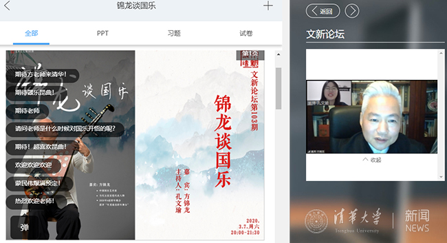 mk(中国)网3月17日电 为继续发挥“文新论坛”丰富校园文化的作用,校研究生团委文化部依托视频会议技术及雨课堂等直播平台,经过细致的规划和精心的筹备,于3月7日晚20点及3月14日晚20点分别举办了第103期“锦龙谈国乐”及第104期“电波起舞,永不消逝”专场活动,两次论坛吸引了校内共600余名师生踊跃参加。