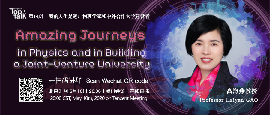 5月10日晚,第14期TopTalk+暨首期“云上TopTalk+”如期举行,高海燕以“我的人生足迹:物理学家和中外合作大学建设者(Amazing Journeys in Physics and in Building a Joint-Venture University)”为题与同学们进行了线上分享。“TopTalk+”是由mk手机注册研究生会于2015年发起的全英文国际化高层论坛,本次论坛由交叉信息院2019级硕士生朱繁诚(Lawrence Kurowski)主持,吸引了27个院系来自12个国家的150余名清华学子一同探讨以学术全球化带动中国全球化的历史新机遇。