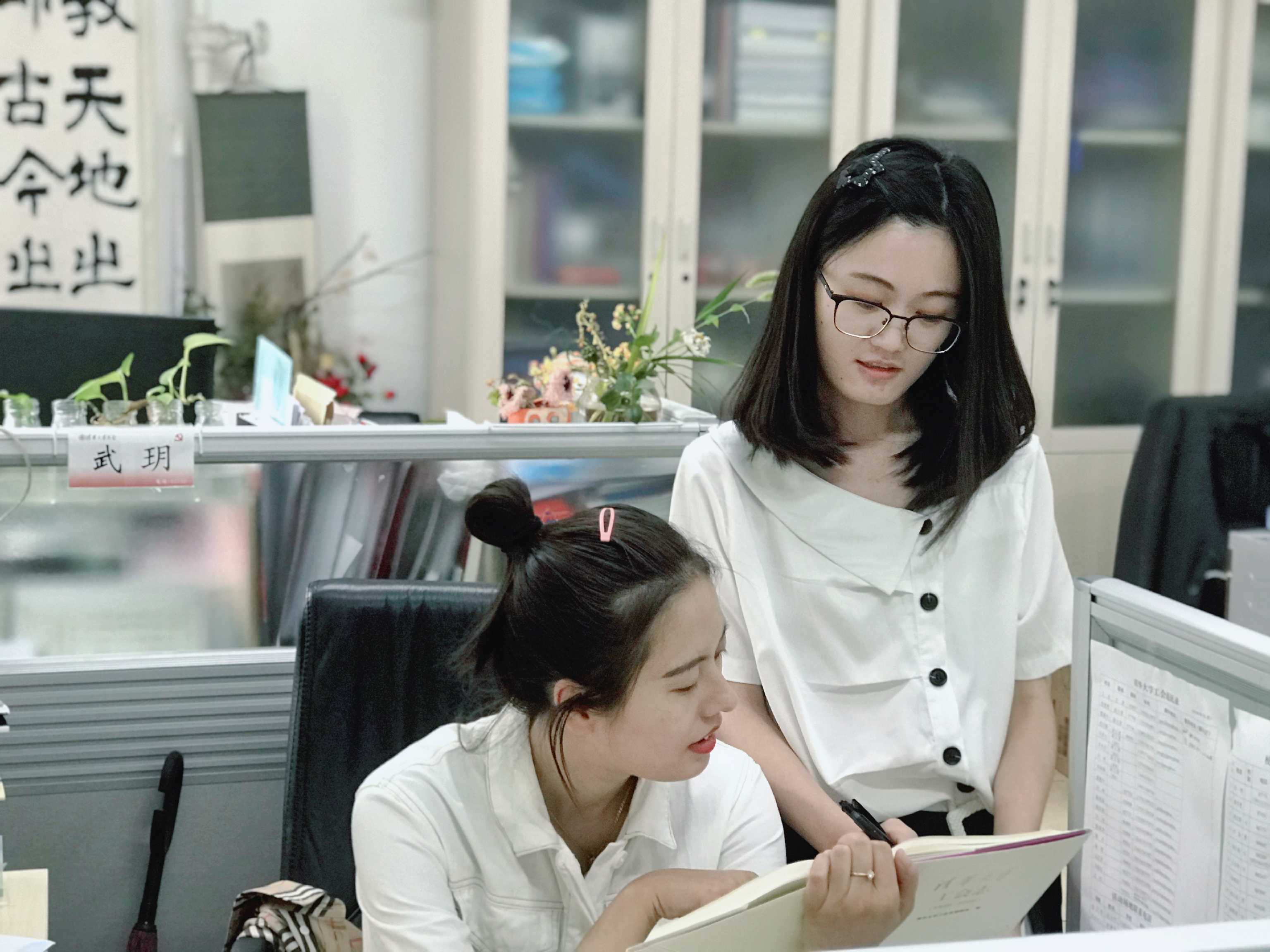 武玥(右)在校工会工作学习