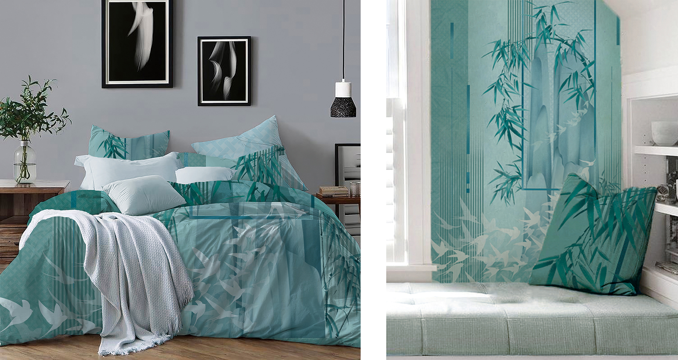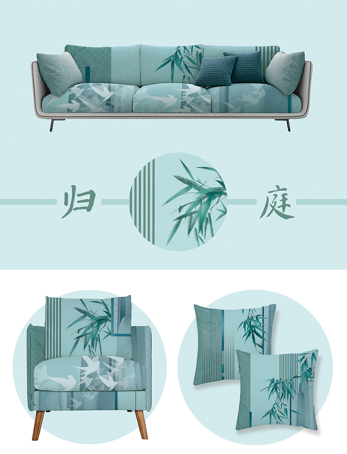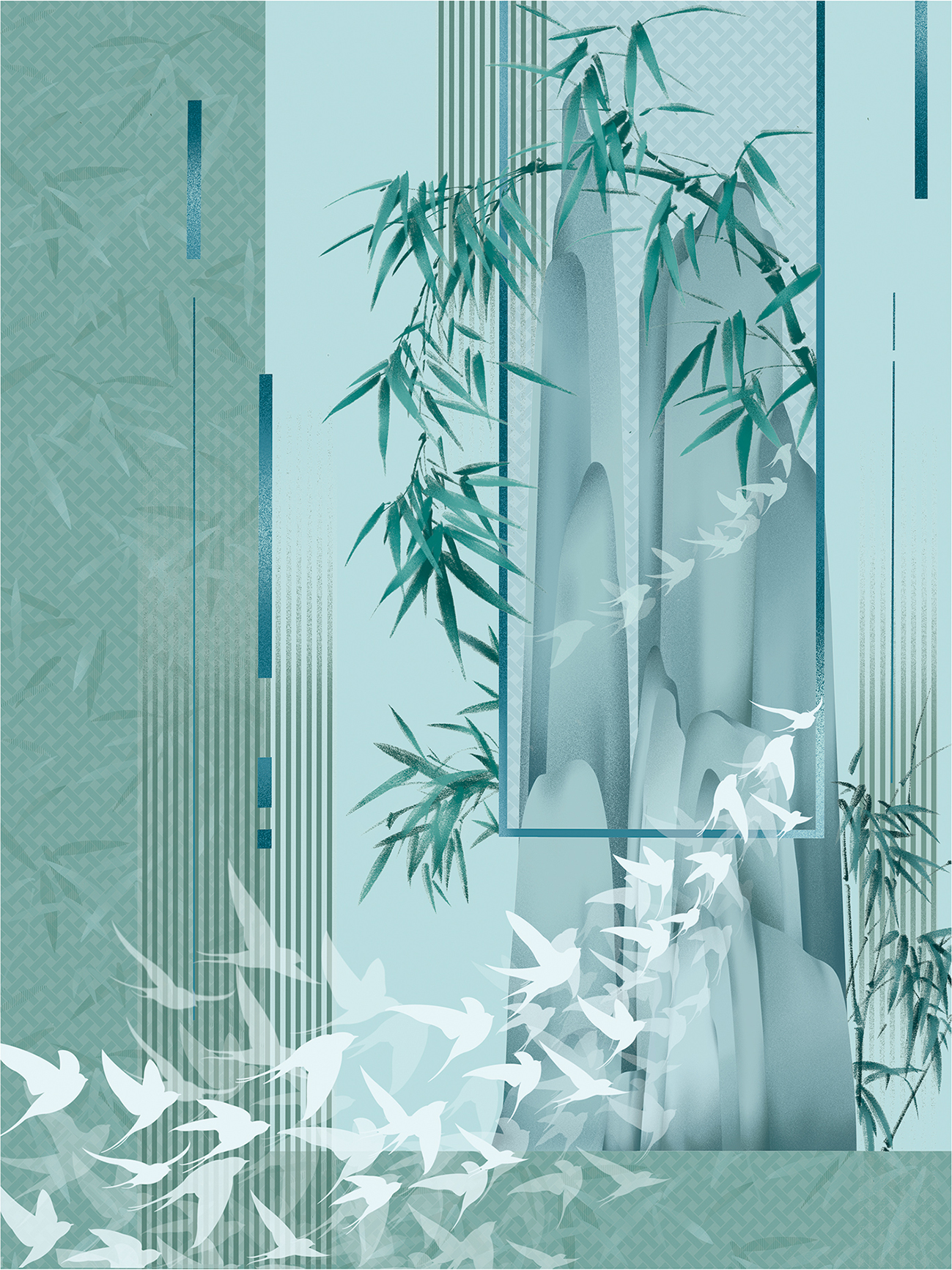 灵感来源于诗句:“空山竹瓦屋,犹有燕飞来”。作品意在表达一种对清雅、幽静、舒适生活的向往。遥望山外看清竹,盼燕归。画面呼应主题,整体选用了清新淡雅的绿色调,以竹子、山为主体,归燕环绕林间,使人感到身心放松。可应用于壁纸、床品、沙发等领域。