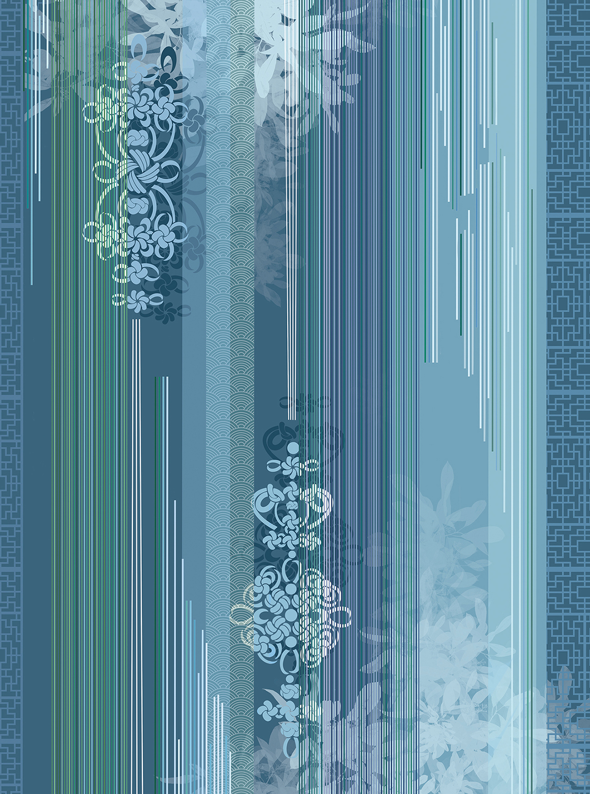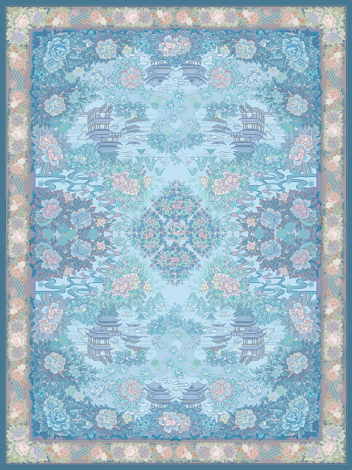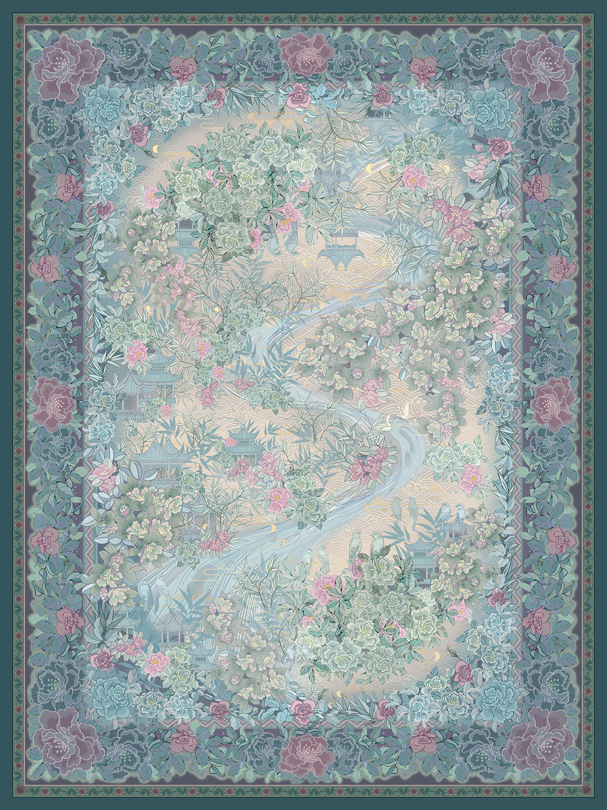 “此地有崇山峻岭,茂林修竹,又有清流急湍,映带左右,引以为流觞曲水列坐其次。”作品灵感来源于魏晋书法家王羲之写的《兰亭集序》,初读《兰亭集序》,就被诗中所描绘的文人雅趣的情景吸引,所以想用自己的理解再现当时曲水流觞、兰亭宴集的画面。整体配色选用蓝绿色系,安静而祥和。主要元素选用了国画中常见的竹子、兰亭、梨花、牡丹等元素,营造素雅安静的氛围。作品主要适用于中式地毯、家用纺织品以及室内软装中。
