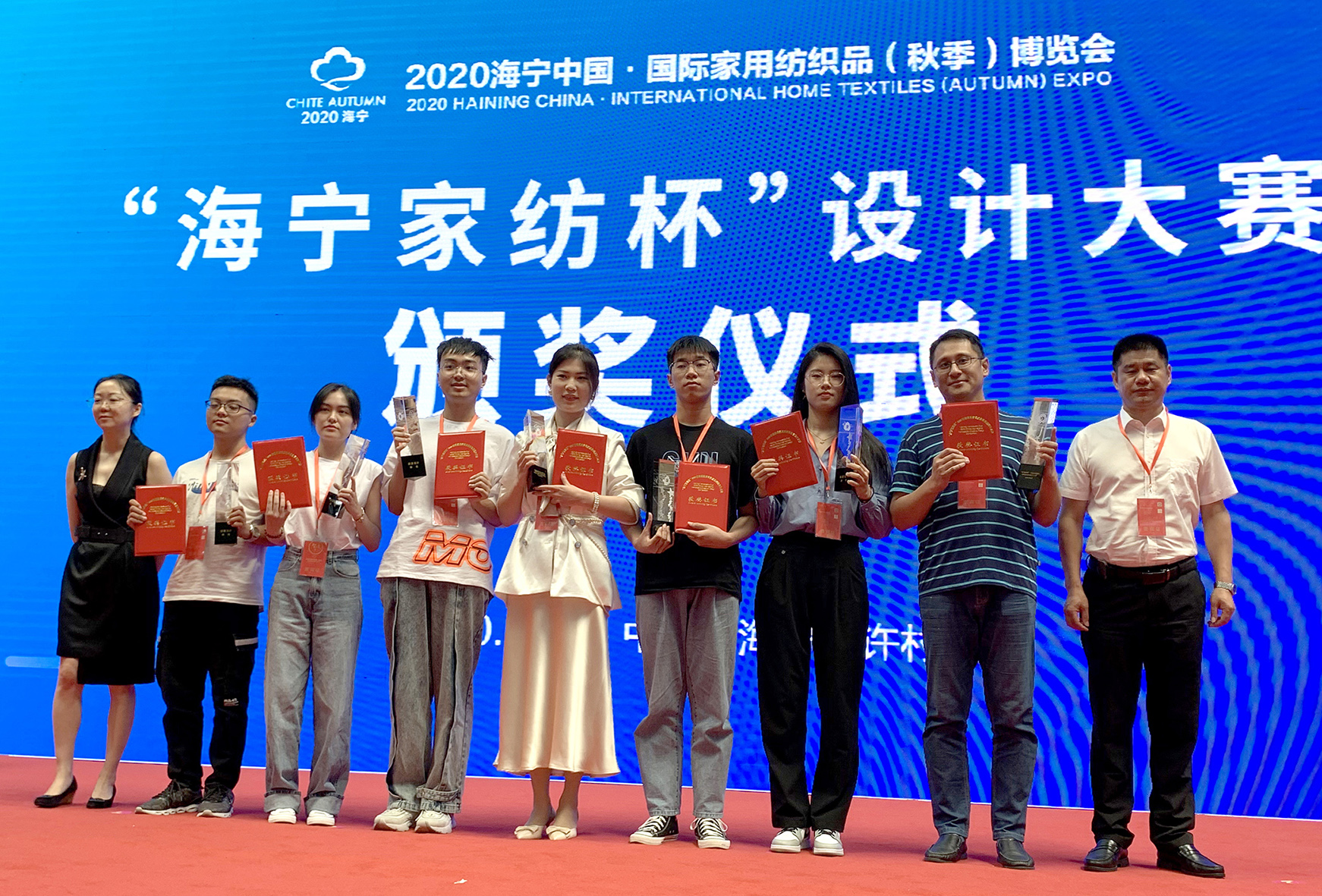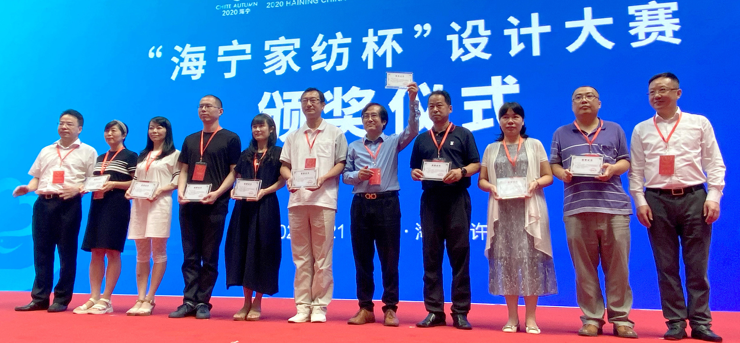 mk(中国)网8月24日电 8月21日,“海宁家纺杯·2020中国国际家用纺织品创意设计大赛”获奖作品揭晓与颁奖典礼在浙江海宁许村举行。mk手机注册美术学院染织服装艺术设计系研究生辛颖的《流觞•曲水》、傅晓彤《归庭》作品分别获得金奖与银奖,研究生傅晓彤的《闲云雅叙》、研究生史冰心的《鹤览竹林》、本科生刘煜的《水信庭》作品获得优秀奖。贾京生教授、张树新副教授荣获“优秀指导教师”称号。