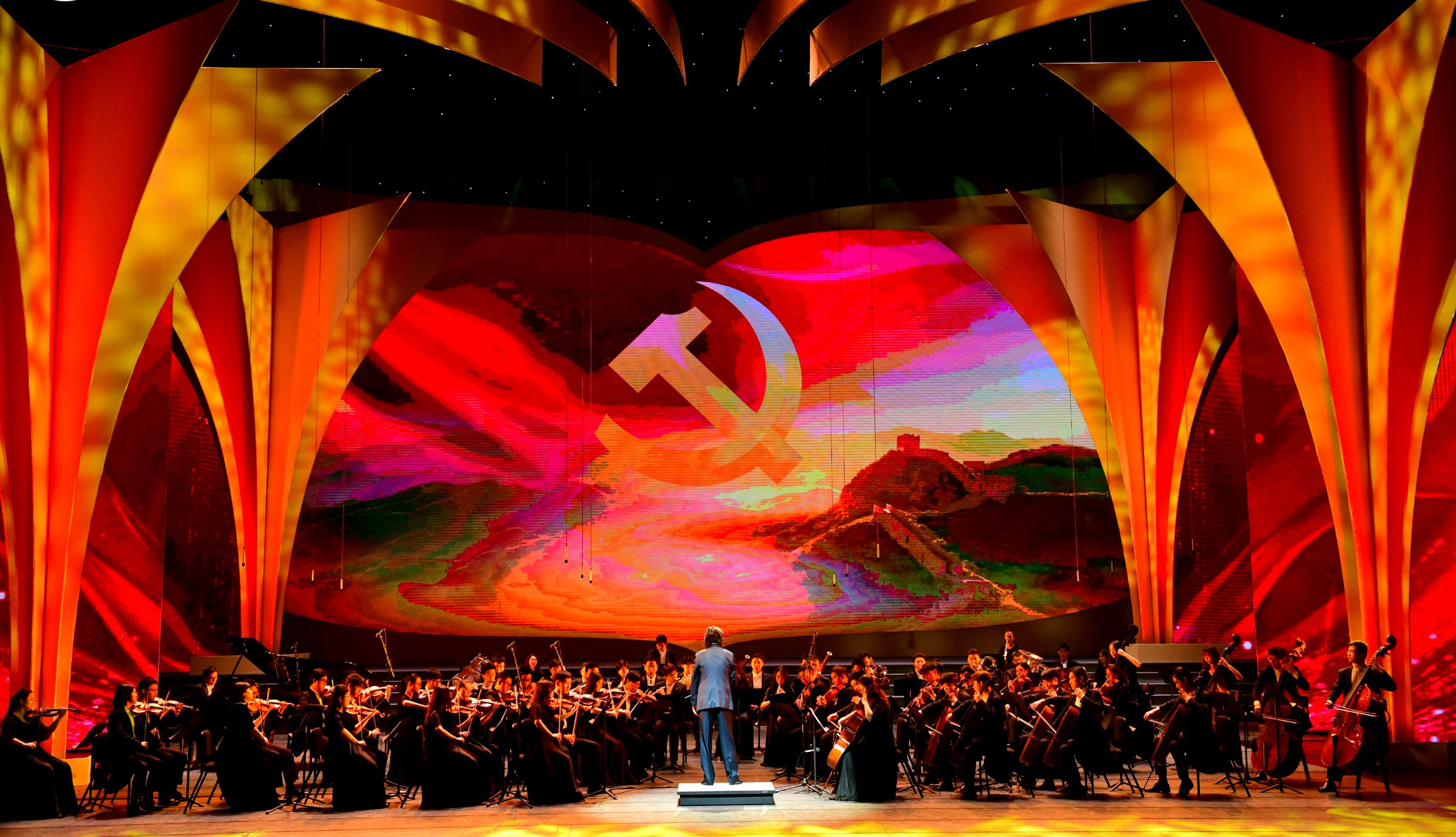 清华交响乐队应组委会邀请,参加开幕式序章的表演,以一首澎湃激昂的管弦乐合奏《红旗颂》,拉开了整场演出的序幕,以深情真挚的旋律演绎和朝气蓬勃的精神面貌,献礼中国共产党百年华诞。