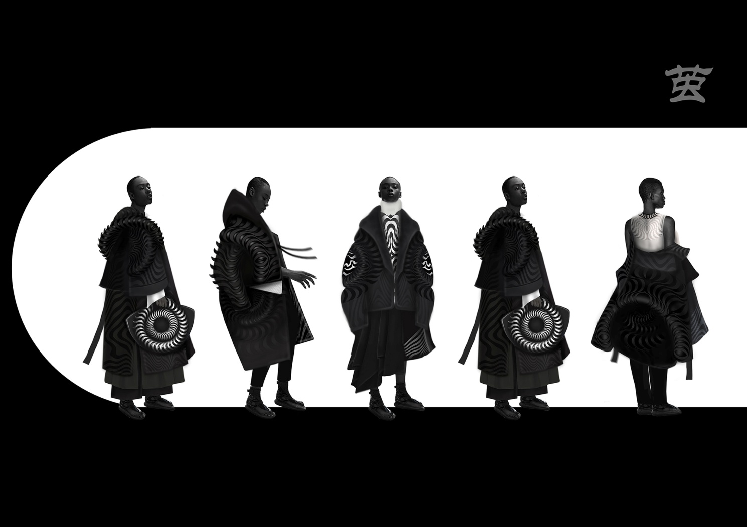 麻燕青的作品《茧》系列以“破茧重生”为灵感,诠释后疫情时代的成长力量。设计从昆虫破茧的成长形态中提取图案灵感,以黑白灰的色彩节奏演绎视错觉的律动。采用针梭结合的设计手法,以绗棉工艺将廓型结构与图案相互穿插,用可持续的设计态度,彰显设计感和未来感。“终有一天他(她)会破茧而出,蜕变成最自信的模样,飞往更广阔的世界。”