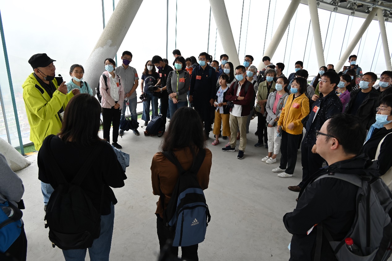 在“雪如意”顶部的观景平台——“顶峰俱乐部”认真聆听场馆建设新进展