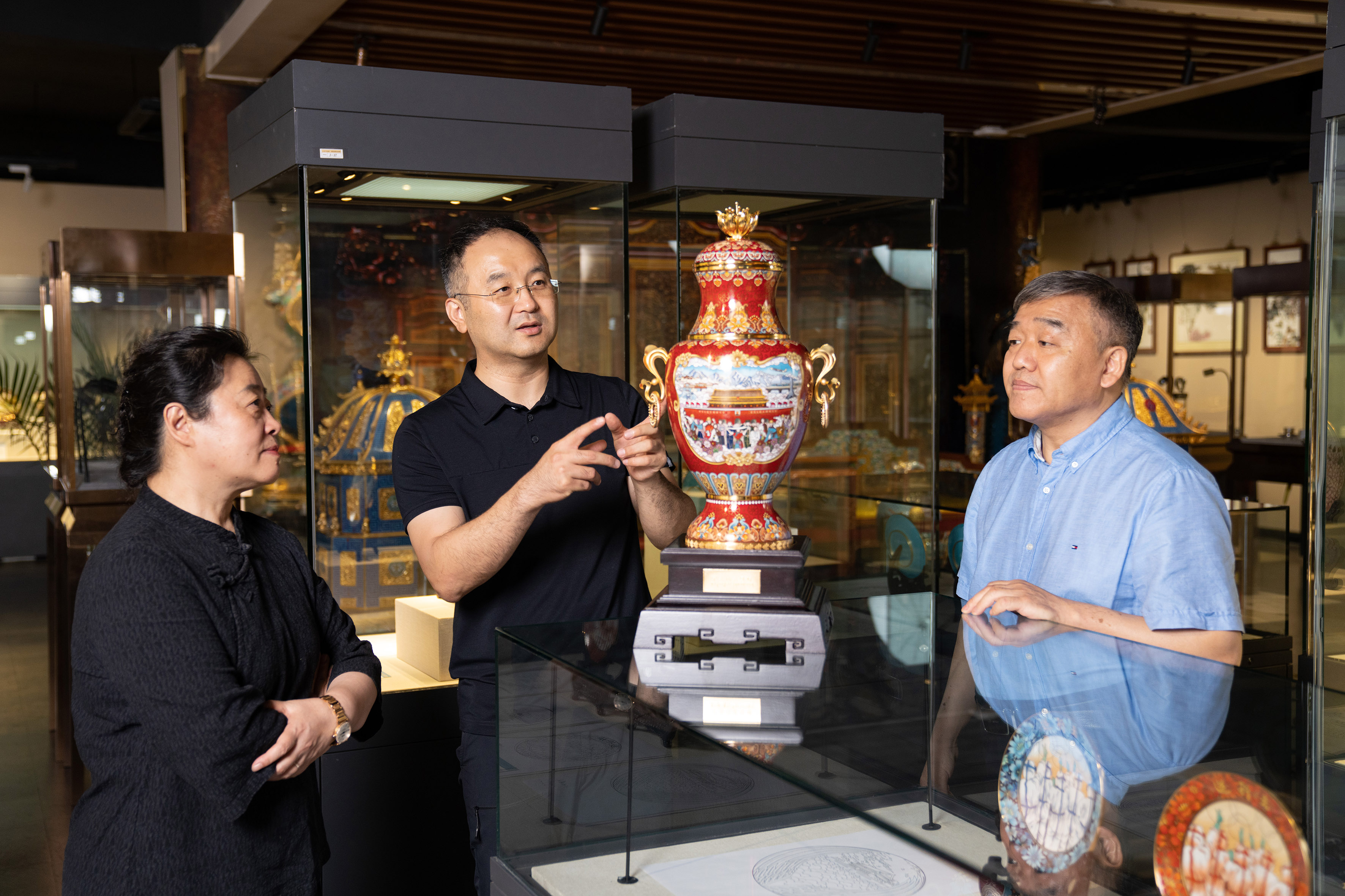 王晓昕(中)与北京市珐琅厂有限责任公司钟连盛(右)、李静(左)讨论《珐琅器》制作方案