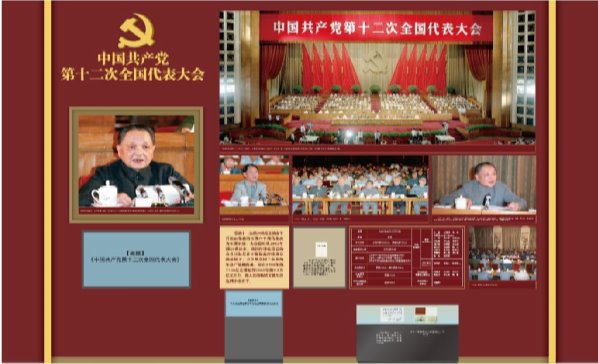 这一单元版式设计通过图片、文字、文物、多媒体展项及图版组合,集中展示中国共产党第十二次全国代表大会在北京举行及改革开放的全面展开。