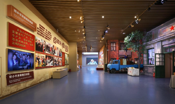 走进邓小平发表南方谈话和改革开放场景,通过实物、影像、声音等元素,展示20世纪70到90年代百姓家庭生活变迁。透过窗户,以高清视频方式,虚拟呈现城乡经济发展。副食品商店旁,透过窗户,复原20世纪80年代店铺、文化书柜、玩具摆放的场景。在面部识别及实时抠图技术支持下,再现观众身着不同年代、不同面料、不同款式的服装的影像。伴随乐曲,观众们可以回忆过去的时光。