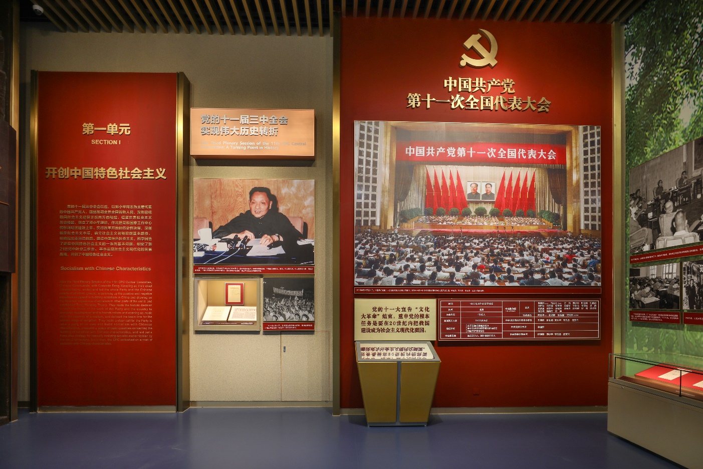 展览馆第三部分需要重点表现的是中国共产党总结过去取得的历史性胜利,全面开创社会主义现代化建设的新局面,确定继续前进的正确道路、制定战略步骤和方针政策内容。展览面积达4600平方米,设计团队精细设计“开创中国特色社会主义”“成功把中国特色社会主义全面推向二十一世纪”“在新的历史起点上坚持和发展中国特色社会主义”三个单元,展线长度920延米。此展线由589张图片、703件实物、14项触摸屏、33套视频、10处场景、11件艺术品、11件模型、2幅地图、26张图表、77幅文字版组成,综合图片和文字展板、文物实物、科技展项、场景复原等多种展示形式设计。