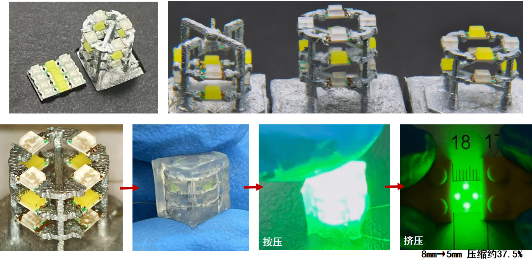 该获奖课题创新性地提出利用3D打印技术打印牺牲材料,再通过巧妙利用Ga-In共溶合金熔点调制的方法,制造出具有三维立体的特征的柔性传感器和集成SMD元器件的电子电路。实验结果证明,该方法较传统柔性电路制作工艺,可以制作平面工艺不能完成的立体自支撑结构,在结构设计和基底材料选择上都具有很高的灵活性,为柔性电子领域提供了新的方法和思路。