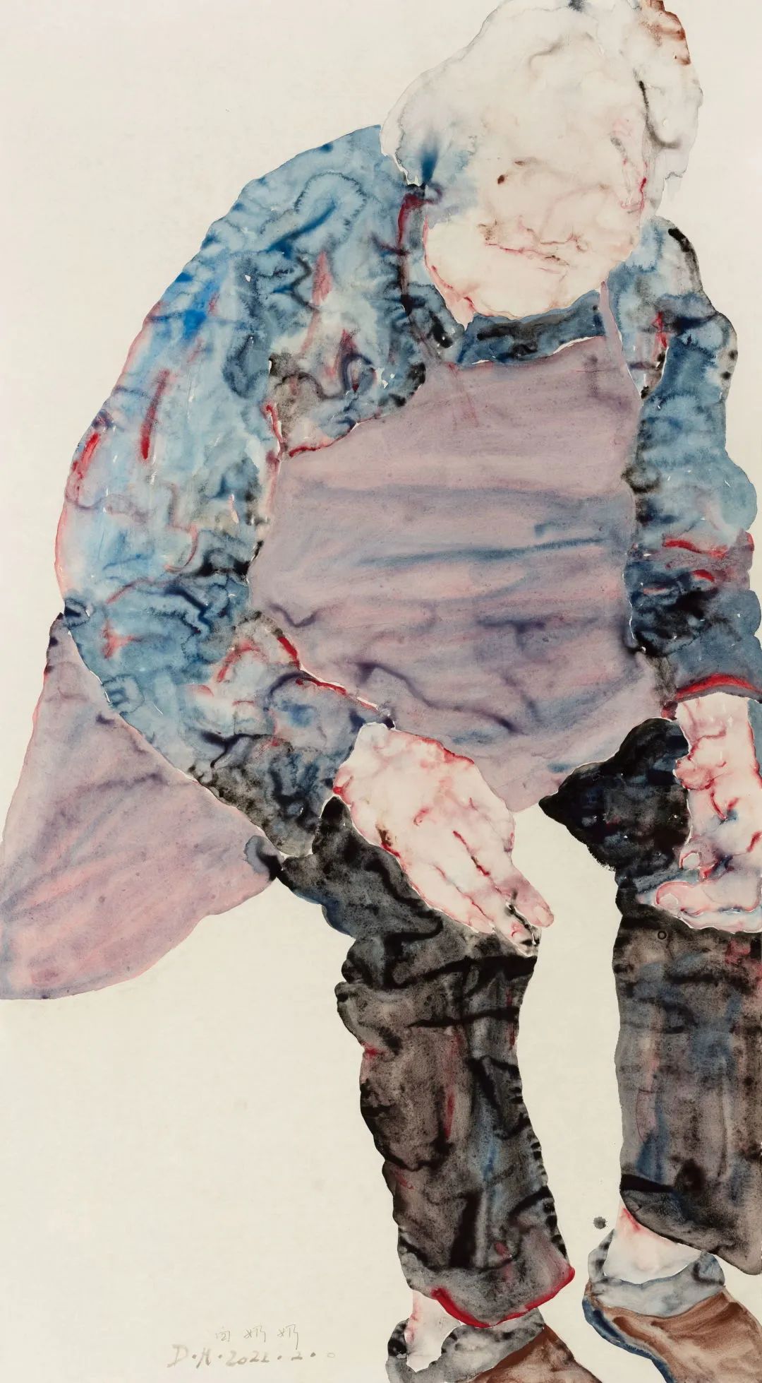 因专攻国画人物的缘故,在丁荭的创作中,无论是早期的《大人体》系列,还是近年来的没骨人物,“人”始终是她创作的重要媒介。她以其独特的观察方式,结合自身的人生经历,感同身受地体悟着遇见的每一个与众不同的生命体,并以此为切入点反思生活,反思生命,反思人性。2021年,丁荭开始了没骨人物的创作,这批作品是她早期《大人体》系列的延续。她直觉地对人特别敏感,并尝试从中寻找能够触碰她神经的东西去表现,这才有了“大人体”系列中“放大”的人体和扭曲的躯干。从精神层面上来看,这些画面借用“人”这个图形为载体,通过艺术家与画面之间的拉扯张力,呈现正在较劲中的“人”的生存状态。