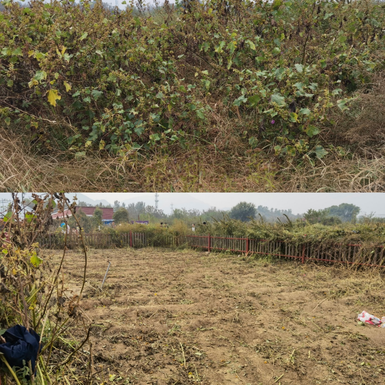 除草前的田地(上)、除草后的田地(下)