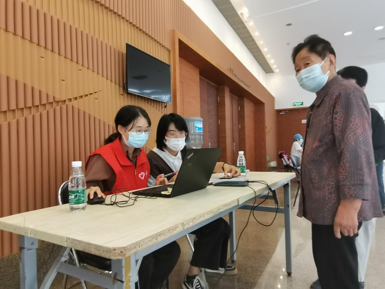 紫荆志愿者主要负责现场秩序维护、信息录入、药盒扫码等工作,各司其职、分工明确。除此之外,志愿者们还配合医护人员做好老人服务保障工作,遇到腿脚不便的老同志立刻主动上前搀扶,为无法自行填写流感疫苗知情同意书的老人代填信息,耐心解答老同志们的问题。工作内容虽然不难,但在人流量大时工作量也不小。来自土木系的2021级本科生李林晟说:“有时候上一份还没填好,就需要帮助填写下一份,身上被汗水打湿,讲话也讲到口干舌燥,脑子都快转不过来了。但每当听见老人们说‘幸好有你们在这儿’‘谢谢你们’时,我感觉一切汗水与疲惫都烟消云散,自豪感与收获感油然而生。希望日后还能参加更多敬老爱老的志愿服务活动,发挥自身能力去帮助他人。”