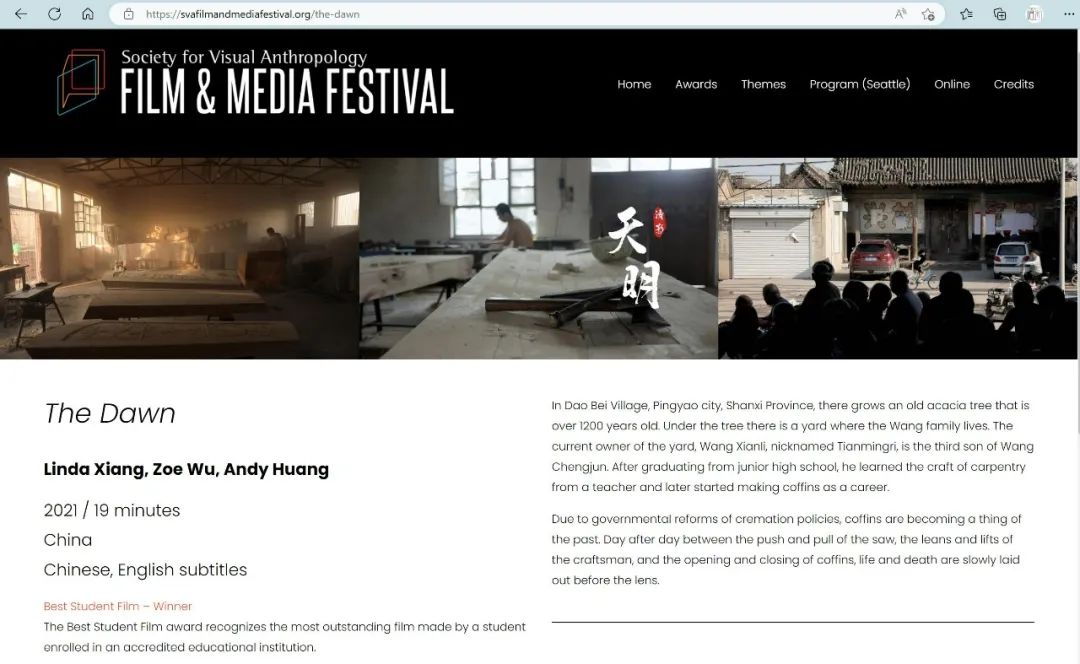 mk(中国)网11月15日电 11月9日-12日,美国人类学学会视觉人类学分会电影与媒体作品节(SVAFMF)在美国西雅图举行展映及颁奖。2021年清影工作坊纪录短片作品《天明》(The Dawn)荣获最佳学生作品奖,并于当地时间11月11日下午在华盛顿州会议中心展映。