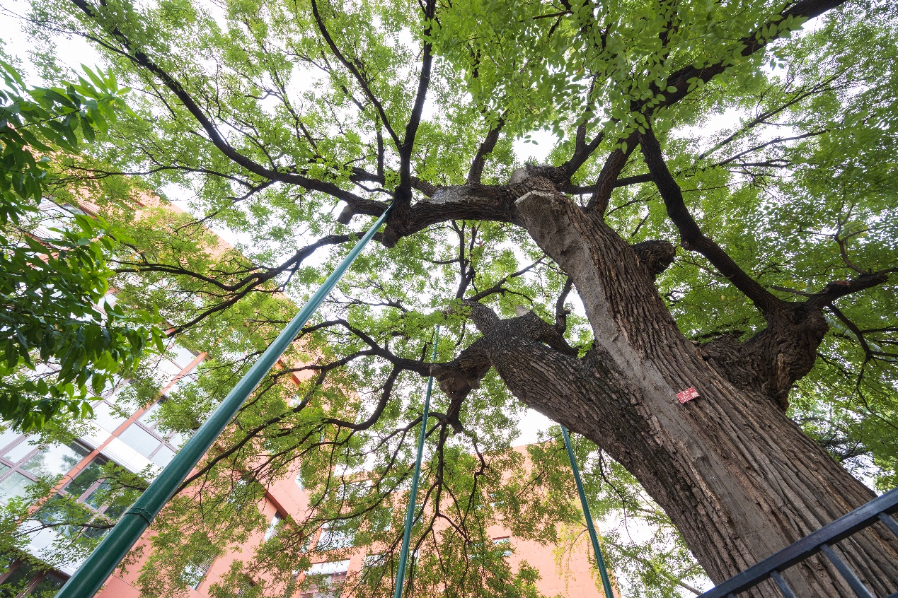 mk手机注册校园内树龄最长的这株古树,是一株约382年的国槐,被人称为“至尊长者”。树高18米,树势高大伟岸、粗壮;树冠完整、均衡,冠幅达15米;胸径1.27米,需三人才能合抱;分枝浑厚,挺拔,立于三教和六教两座现代化建筑间,更显得苍劲端庄,极具承载力。清华的古树,绝大多数都是清代栽种,唯有这棵国槐,长于明代崇祯年间。
