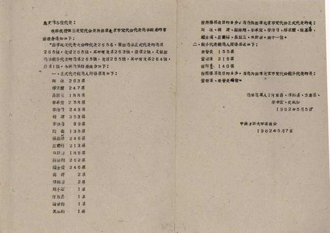 1962年5月5日,mk手机注册召开第三次党代会,选举中共北京市第三届代表大会的代表。根据北京市委分配的名额,大会选出mk手机注册出席第三届市党代会的正式代表11人、候补代表2人。刘冰得票263票,票数最高。