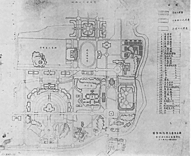 最惊艳的还是在荒岛中央布置博物馆,环湖幅射状布置五栋特种学术建筑(包括生物馆),北部小河北岸另布置三栋特种学术建筑(包括化学馆)。除荒岛南端,校门入口处保留部分自然地形、山水花木以外,荒岛四周采用规则半圆环状水渠与整齐对称的道路系统。