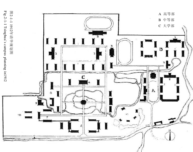 在他的规划中,预备学校位于校园东部,基本保持1911年清华学堂校园规模,保存工字厅建筑群,以新建的大礼堂为中心,布置高等科教学区。区内建科学馆,一院大楼向东延伸,而二院则全部拆除,周边式布置教学楼,高等科学生宿舍与食堂;拆除三院,新建中等生教学楼;拆除北院,建中等生宿舍与食堂。此外,新教学区还修建了体育馆与图书馆。