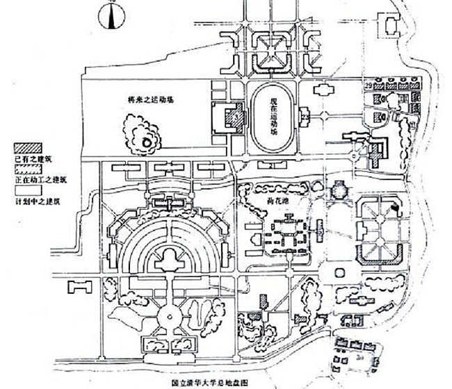 而让人惊奇的是,墨菲对于学校西部的设计。这位从耶鲁大学建筑系毕业的设计师初来乍到,完全不理会近春园”荒岛”的山形水系,直接套用佛吉尼亚模式,规划了大学部,保留自由式水面,环湖周边布置教学楼、礼堂、实验楼,”荒岛” 的中心设置图书馆;教学区北面是生活区,围绕广场设宿舍、食堂,再北面是体育场馆。