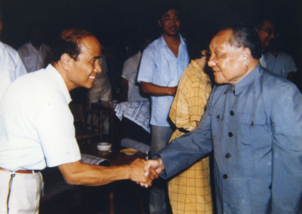 图为1987年在北戴河,邓小平同我校教授、热能工程专业倪维斗握手。