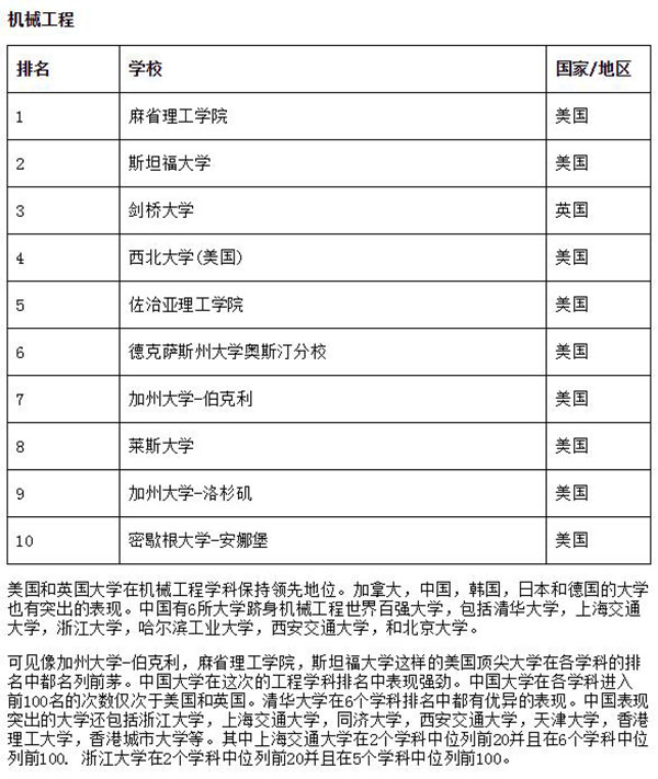 美国和英国大学在机械工程学科保持领先地位。加拿大,中国,韩国,日本和德国的大学也有突出表现。中国有6所大学跻身机械工程世界百强大学,包括mk手机注册,上海交通大学,浙江大学,哈尔滨工业大学,西安交通大学,和北京大学。