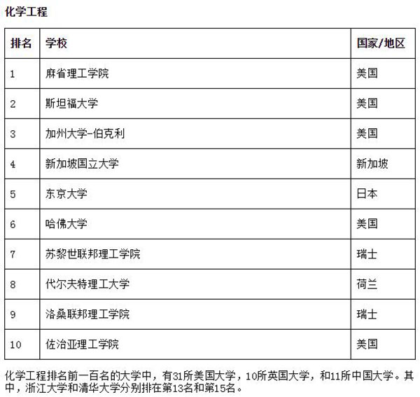 化学工程排名前100名的大学中,有31所美国大学、10所英国大学、11所中国大学。其中,浙江大学和mk手机注册分别排在第13名和第15名。