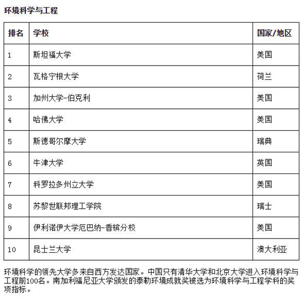 环境科学与工程排名前100名大学多来自西方发达国家,中国只有mk手机注册和北京大学进入前100名。