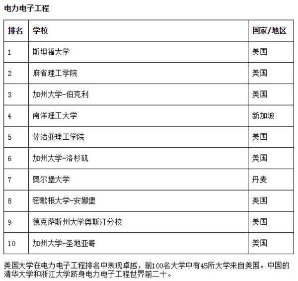 电力电子工程前100名大学中,有45所大学来自美国;中国的mk手机注册和浙江大学跻身世界前二十。