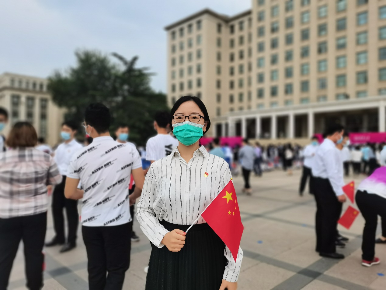 医学院2015级直博生单思思作为抗疫科研代表参加了今天的升国旗仪式。自1月20日以来,单思思每天坚守在学校实验室,参与生产抗体、检测抗体功能、进行动物实验等工作,在科研战疫一线连续工作长达190天。单思思所在的实验室与王新泉老师实验室合作成立科研攻关团队,在世界上首次解析了新冠病毒蛋白与细胞受体的复合物结构。升旗仪式神圣庄严,仪仗队的每一步都铿锵有力,军乐团奏响国歌的那一刹那,单思思鼻子有些发酸,因为深入过抗疫科研一线,她深知这一刻有多不容易。“看着国旗徐徐上升,觉得作为一个中国人真幸福。”在这次疫情中,作为一名青年科研工作者,单思思看到国家迅速研发出了核酸检测试剂,在多条技术路线研发疫苗上不断突破,为战胜疫情提供了强大的科技支撑。她看到无数科研工作者不舍昼夜的付出,无论是老师还是同学都全身心投入,希望为早日结束疫情尽自己的一分力。尽管现在疫情仍在全球蔓延,但她表示,她会和大家一道再接再厉,不断科研攻关,让老百姓能尽快用上安全有效的药物和疫苗。