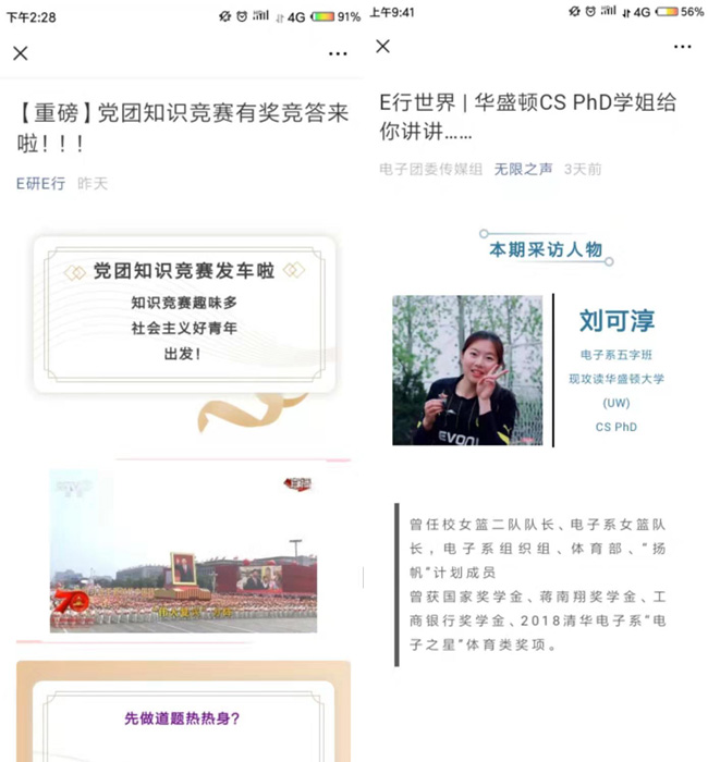 电子系学生口“E研E行”与“无限之声”微信公众号推送截图