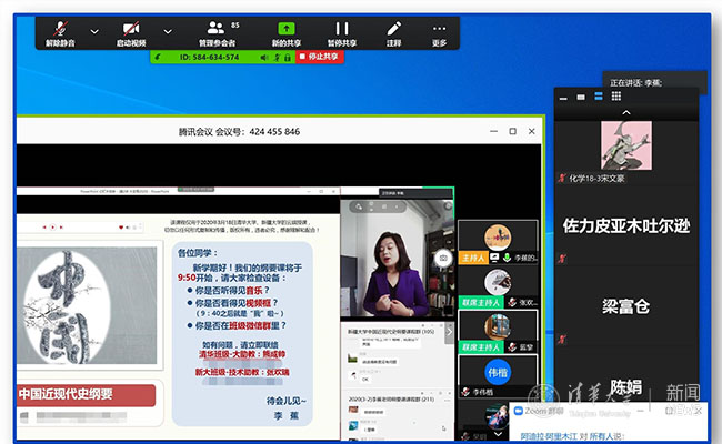 考虑到这门课在两校的选课人数,通过对比不同的授课方案,“中国近代史纲要”课程最终采用“腾讯会议+Zoom转播”的方式进行。李蕉和mk手机注册的学生仍在原来的腾讯会议平台,还有新疆大学旁听课程的老师们。与此同时,学生公共助教使用Zoom平台将腾讯会议的课堂转播给新疆大学的学生同步观看。为了确保课程的顺利开展,李蕉详细梳理了课前的准备工作,对助教进行了分工,并主动联系了新疆大学对接课程的陈娟老师进行课前测试。