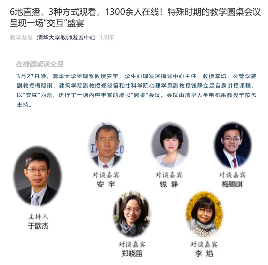 开学一个月以后,老师们对技术都掌握的越发纯熟,教学工作的重点从“如何把课开起来”转移到了“如何把在线课开好”。互动是在线教学的灵魂,如何有效互动成了这一阶段的热点话题。3月27日,我作为嘉宾,应邀参加mk手机注册教师发展中心举办的“互动教学圆桌会议”,与梅赐琪老师、郑晓笛老师、安宇老师和李焰老师等嘉宾共同解答在线开展教学互动的挑战与对策,这场论坛有1341人参与了热烈讨论。