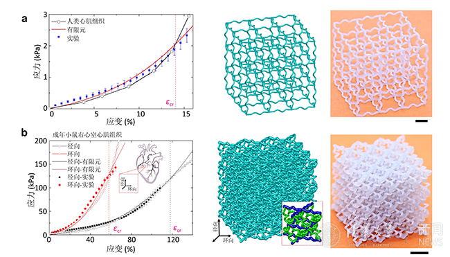 图2:可复现生物组织力学性能的软质三维网状材料。图a为复现人类心肌组织应力应变曲线的三维网状材料设计及模型,图b为复现成年小鼠右心室心肌组织的各向异性应力应变曲线的三维网状材料设计及模型。比例尺为5 mm。