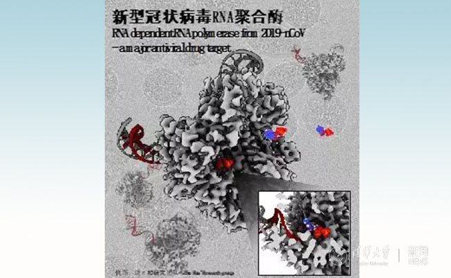 新型冠状病毒RdRp-nsp7-nsp8聚合酶复合物2.9埃分辨率分子结构(Coulomb potential map)。螺旋状分子为类比同类机制聚合酶判断的RNA模版链(灰色)与新生链(红色)的位置和走向;瑞德西韦预期以效应分子(GS-443902)的形式结合于催化反应中心阻断RNA合成(右下插图);背景为新型冠状病毒冷冻电子显微照片及聚合酶复合物处于不同视角下的分子形态。