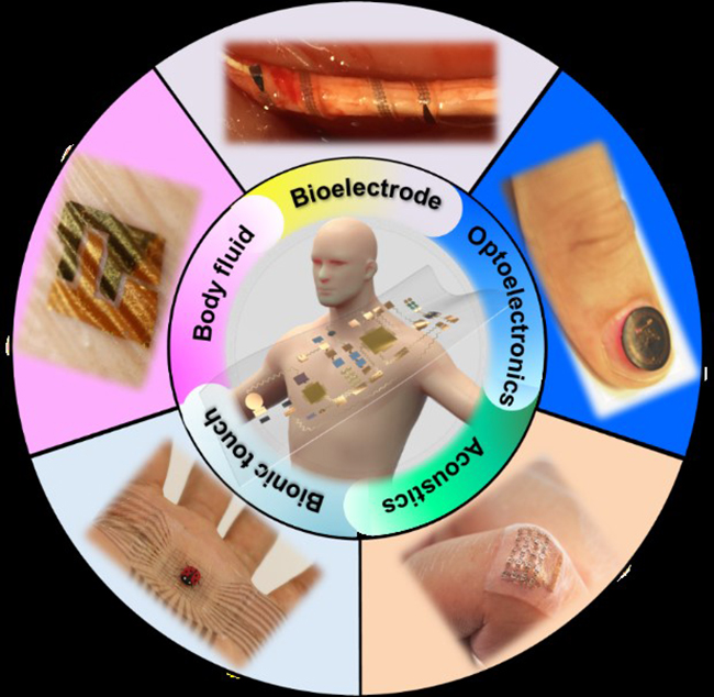 人体是巨大的信息融合体,包括生理电、光、声、生化、机械变形等生理信号,获取这些人体生理信息是实现数字化医疗的基础。冯雪教授团队发表的论文《柔性混合电子与数字医疗》从柔性混合电子技术在材料和结构方法的发展历史出发,总结了柔性混合电子实现的两种主要途径——通过材料的创新,发展本征具有柔性或者可延展的电子功能材料,或引入力学结构的设计。该论文系统地阐述了柔性混合电子器件在柔性生理电器件、柔性光电器在件、柔性声学器件、柔性类皮肤功能器件和柔性生化检测器件等生物医学方面的应用,总结了未来柔性异质电子器件的研究中所要遇到的挑战。