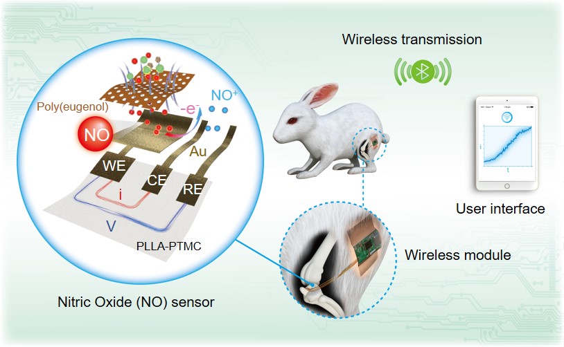体外实验中,传感器可以实现从细胞到各种不同生物组织的一氧化氮释放行为探测。在植入体内后,通过无线传输系统可以远程监测到骨关节腔在炎症反应下的一氧化氮持续释放。这种柔性瞬态电化学传感器不仅解决了传统方法无法实现一氧化氮的连续实时测量的问题,还具有可生物降解、无需二次手术取出的显著优势。该研究为明确内源性一氧化氮的生理功能及其相关作用机制提供了新研究方法,也为柔性可降解生物传感器的设计和制备提供了新的思路。
