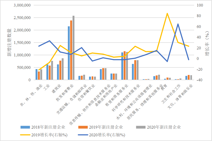 分行业看,教育,文化、体育和娱乐业,住宿和餐饮业等行业在疫情中受到严重影响,其创业活跃度出现下滑,而农、林、牧、渔业,工业,卫生和社会工作的新注册企业增长率出现了显著上升。