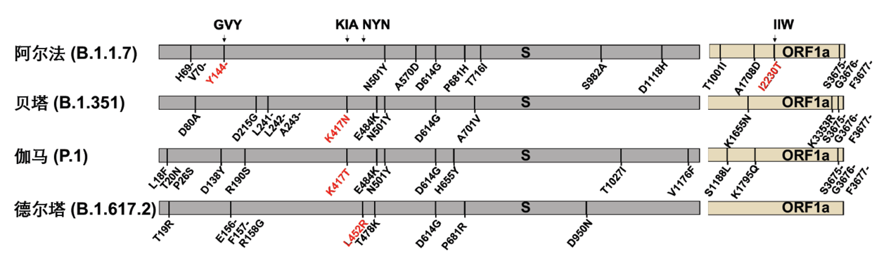 新冠病毒的S蛋白介导病毒进入细胞,是中和抗体的主要识别靶点,S蛋白上的突变被证实能够导致病毒逃逸中和抗体,也因此最为受到关注。图5列出了4种关注变种的起源以及其在新冠病毒S蛋白上的突变位点。